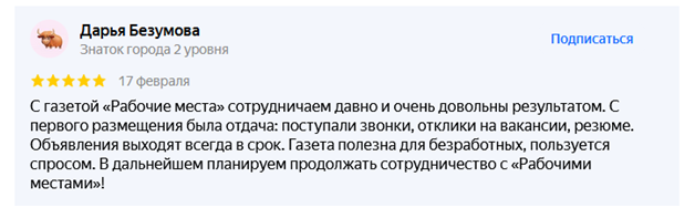 Самый весомый аргумент, характеризующий работу газеты – это отклик соискателей. Звонки поступают, значит, издание читается, наши объявления просматриваются. Именно это мы ценим в сотрудничестве с газетой «Рабочие места».