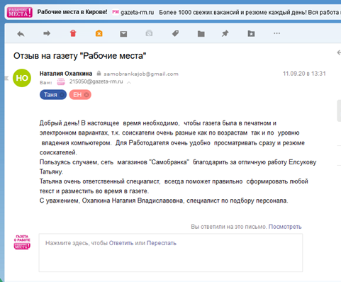 Хотим выразить искреннюю благодарность изданию газеты "Рабочие места" за высокий уровень сервиса и надлежащее качество работы, а также поставить высокую оценку менеджеру Ефремовой Надежде за профессиональный подход, консультации и решение спорных вопросов по размещению рекламы на Ваших страницах. Всегда активная, веселая и доброжелательная, приятно работать.