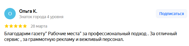Мы сотрудничаем с газетой «Рабочие места» уже четвертый год. Довольно часто размещаем вакансии в газете и уже стали постоянными клиентами. Публикации в газете «Рабочие места» дают хороший отклик и приток кандидатов, что говорит о том, что газету активно читают. Радует наличие скидок для постоянных клиентов и возможность размещения информации в кратчайшие сроки и на нужной странице. Желаю Вам процветания, расширения и долголетия, так как вы делаете нужное дело для людей.
