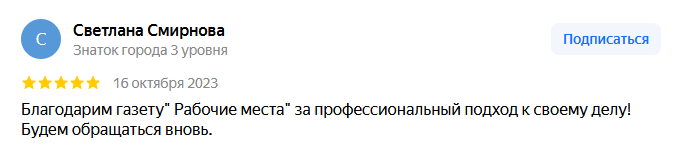 Мы удовлетворены качеством работы газеты «Рабочие места», менеджер газеты работает хорошо, ответственно.